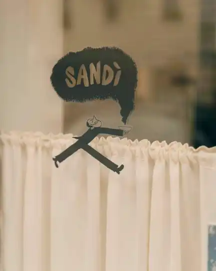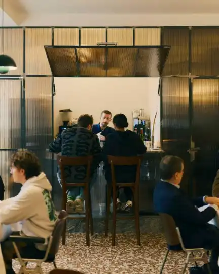 Sandì – a portmanteau of Santosuosso’s surname and Mollica’s nickname – occupies a beautiful 1960s street-level space that was once a bakery. Original design details have been preserved, including a Palladian marble floor with flashes of pink. In-demand design studio Parasite 2.0 is behind the subtle refurbishment work and the striking metal-and-glass wall at the far end that opens like a kiosk.