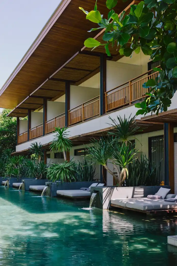 A well-engineered two-storey hotel and spa with 38 rooms and a restaurant that extends out into the sea.
