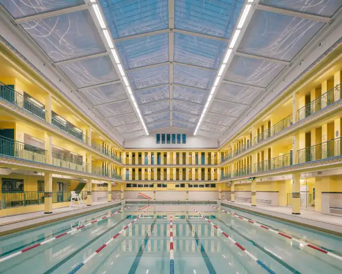 Few places provide a better swimming experience than Paris’s Piscine Pontoise. With its yellow walls, blue decorative motifs and glass roof, this art deco pool in the 5th arrondissement is a jewel of the city’s architectural heritage. Designed by architect Lucien Pollet, whose works include the Piscine Molitor (now an M Gallery hotel) and Piscine Pailleron (in the 19th), the Pontoise has been open to the public since 1934 and has earned a place on the city’s list of historical monuments. But wear and tear had left the pool in a state of disrepair and the city of Paris closed its doors in 2019 for some much-needed renovations.